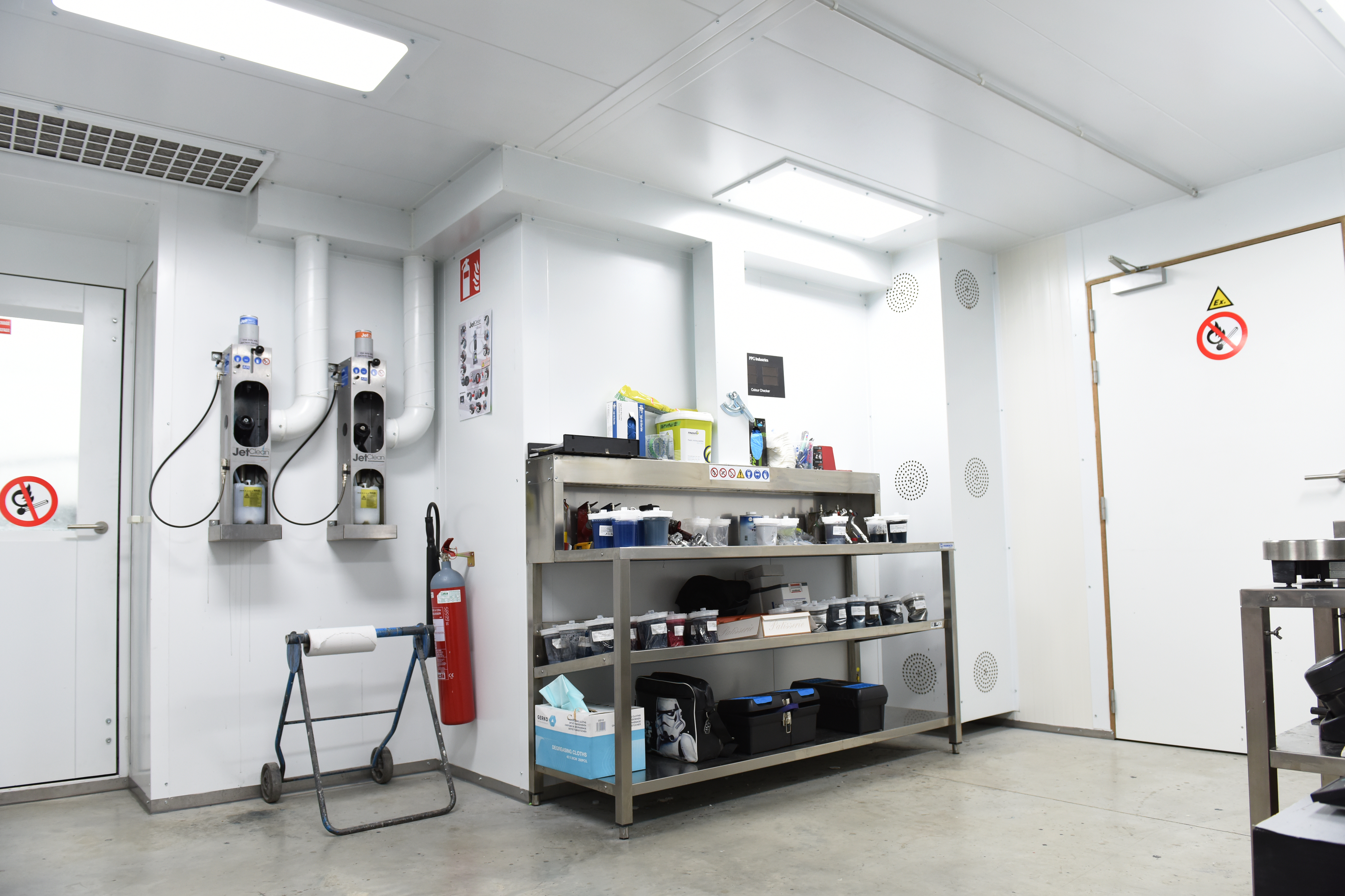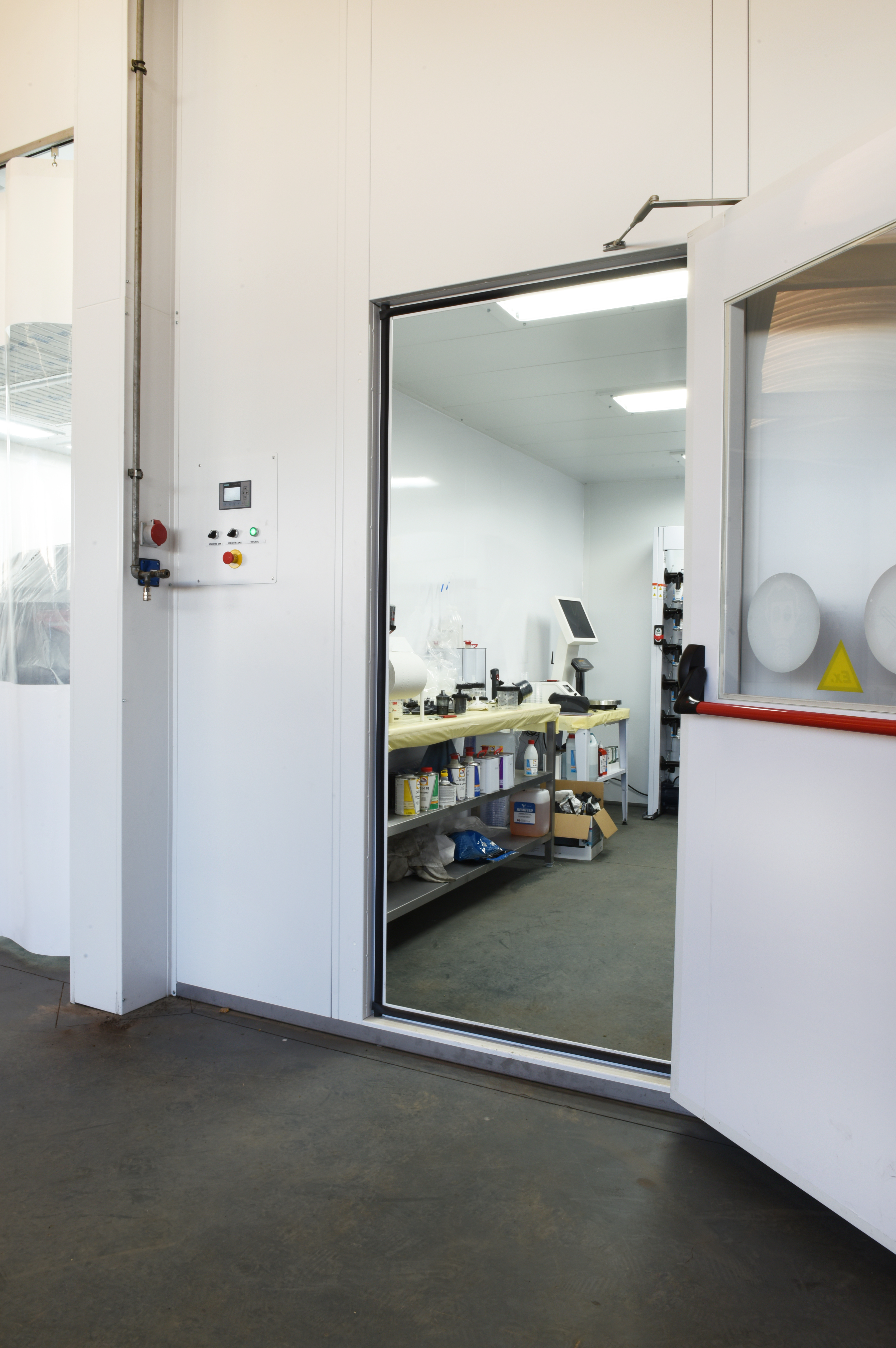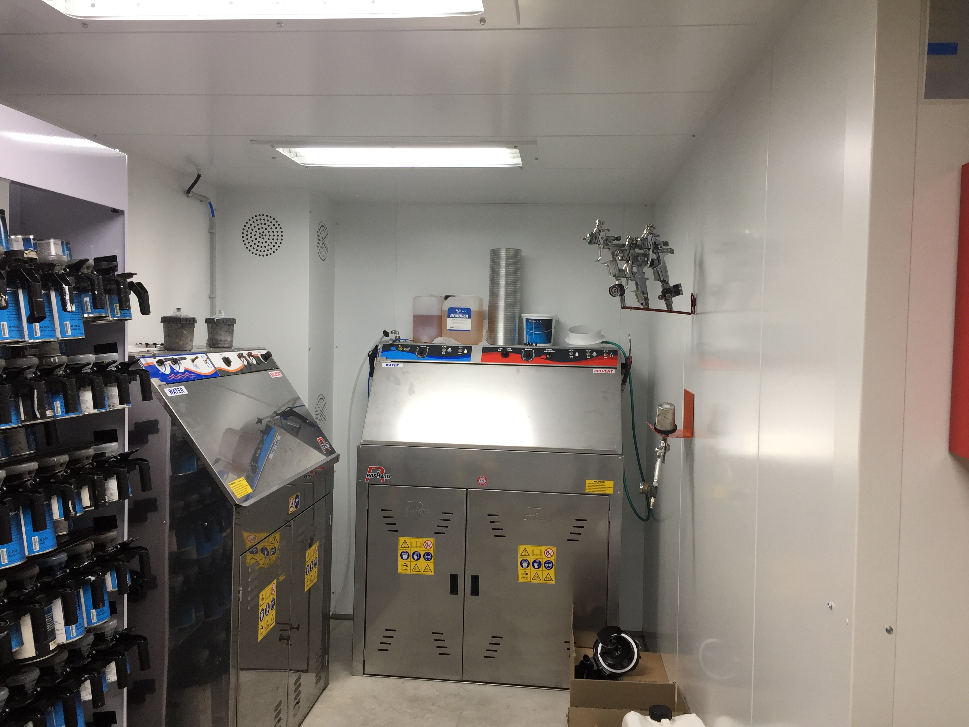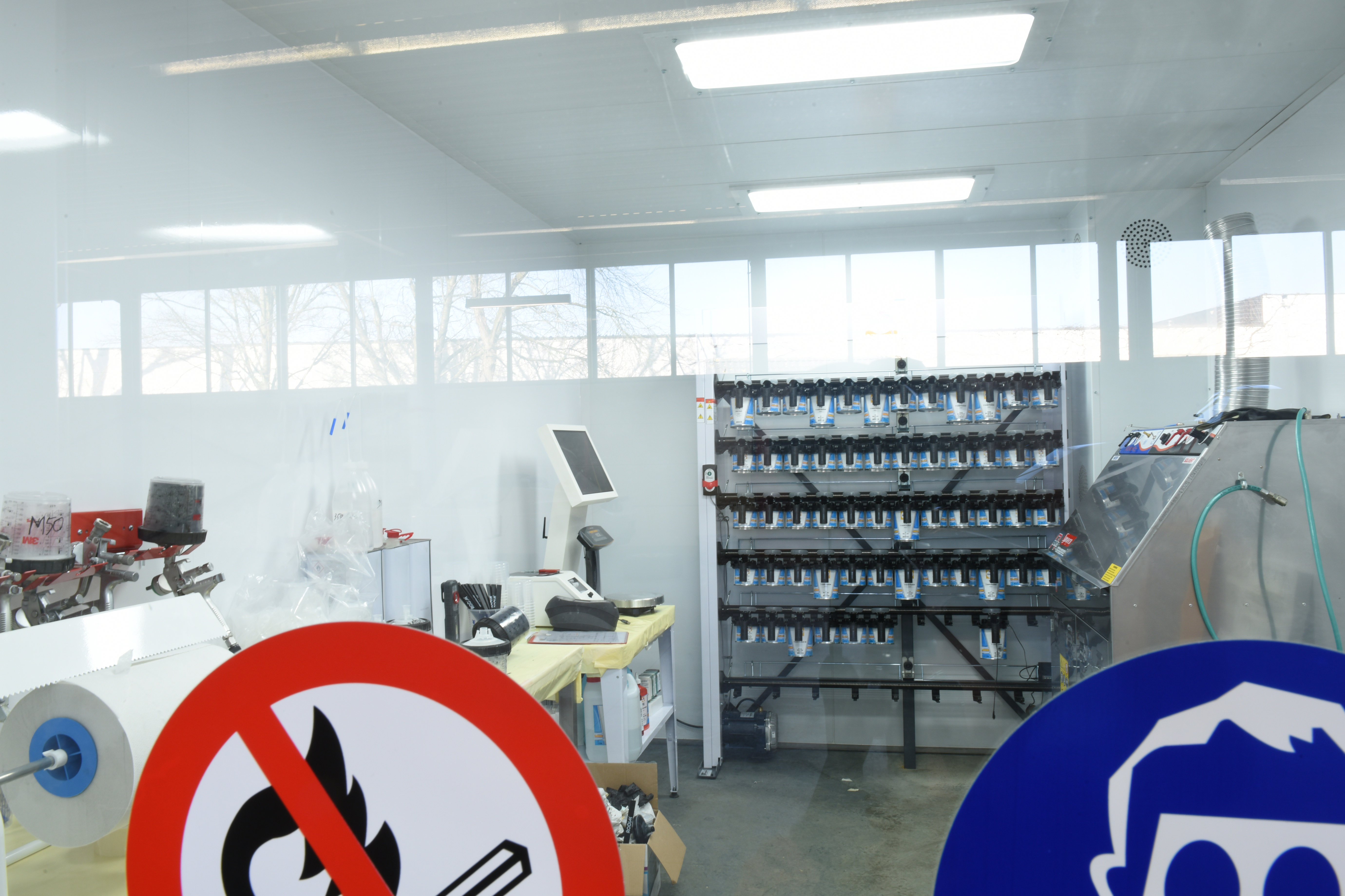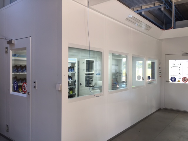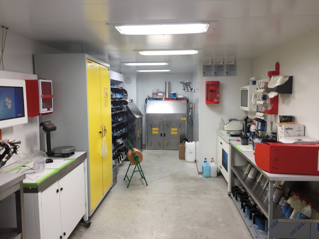 Dagopslaglokalen, ook wel labo's genoemd zijn opbouwd uit dubbelwandige panelen met 60mm rotswol isolatie (idem als spuitcabine). Het zijn geconditioneerde ruimtes voor uw verfmengactiviteiten en dagstockage en kunnen op maat worden gemaakt.